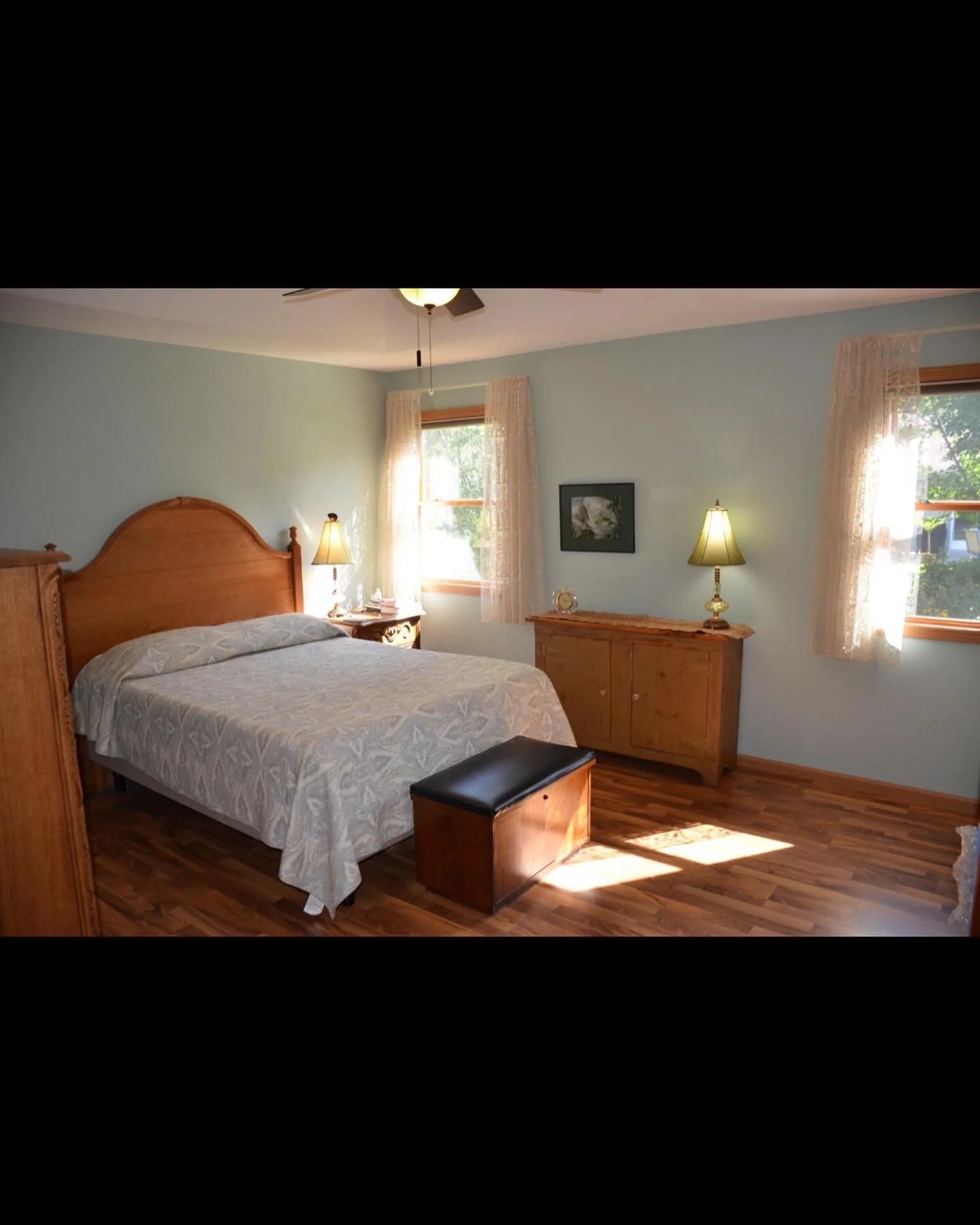 This master bedroom had plenty of space to work with, but needed some spice. We decided to add some peel & stick wallpaper with a fun accent wall with black and white dot pattern. Bedside sconces were installed for reading light. A jute rug fit nicely and added texture to the space. Hanging the curtains high helped to give the illusion of higher ceilings and draws the eye up to the tray ceiling detail.