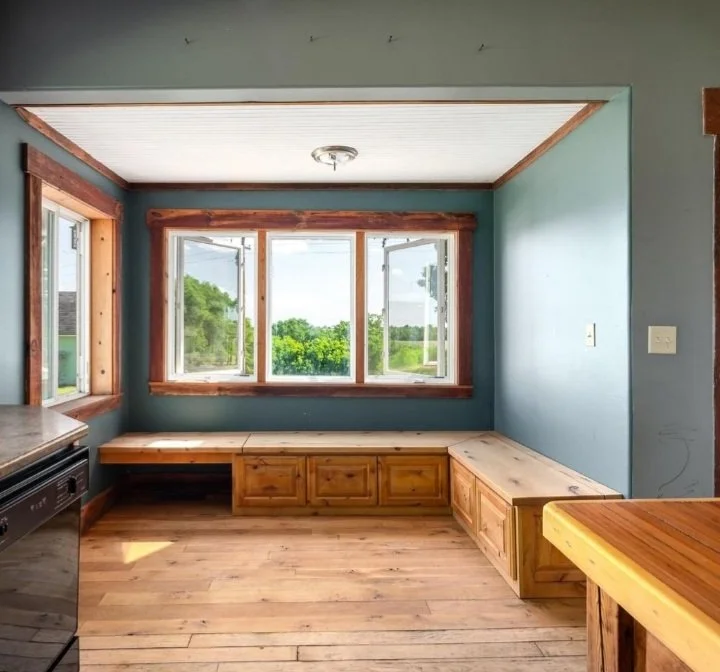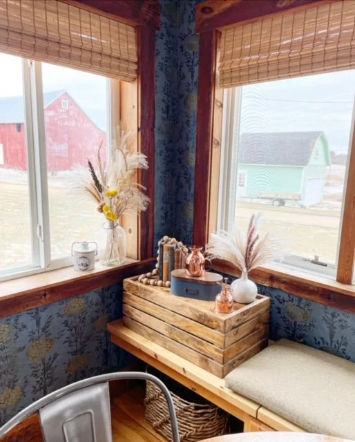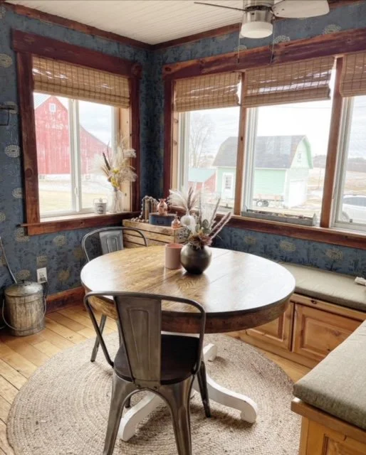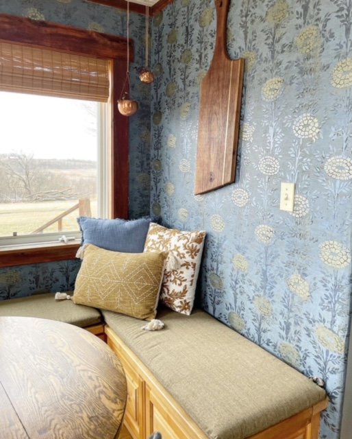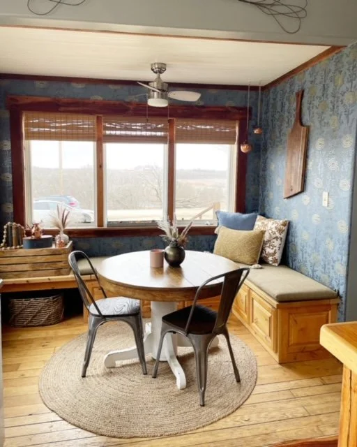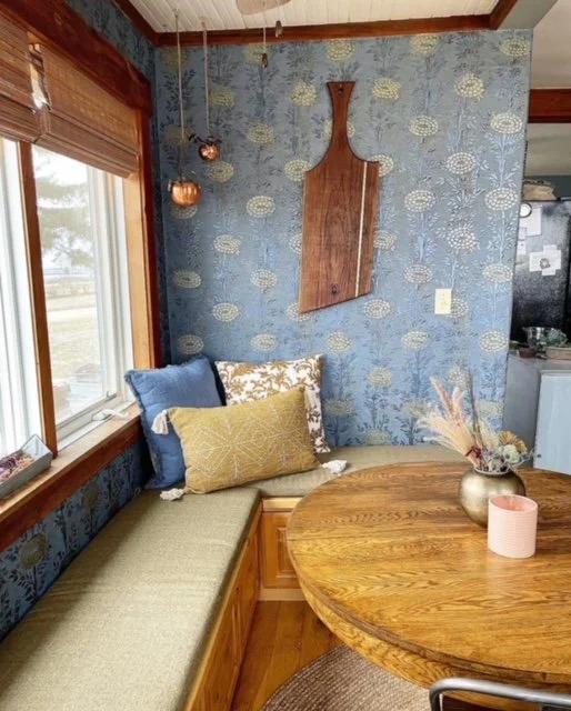 This farmhouse kitchen nook got a fun revamp! The owners wanted this space to be a cozy gathering space where they can enjoy the views of their beautiful flower farm. My client knew she wanted to use some fun wallpaper, so she chose this gorgeous French Marigold wallpaper with gold accents - it makes such a statement!