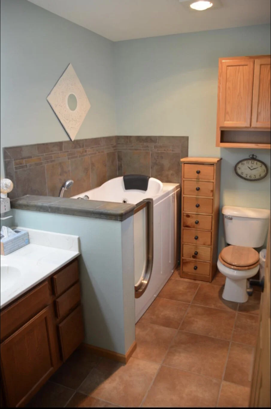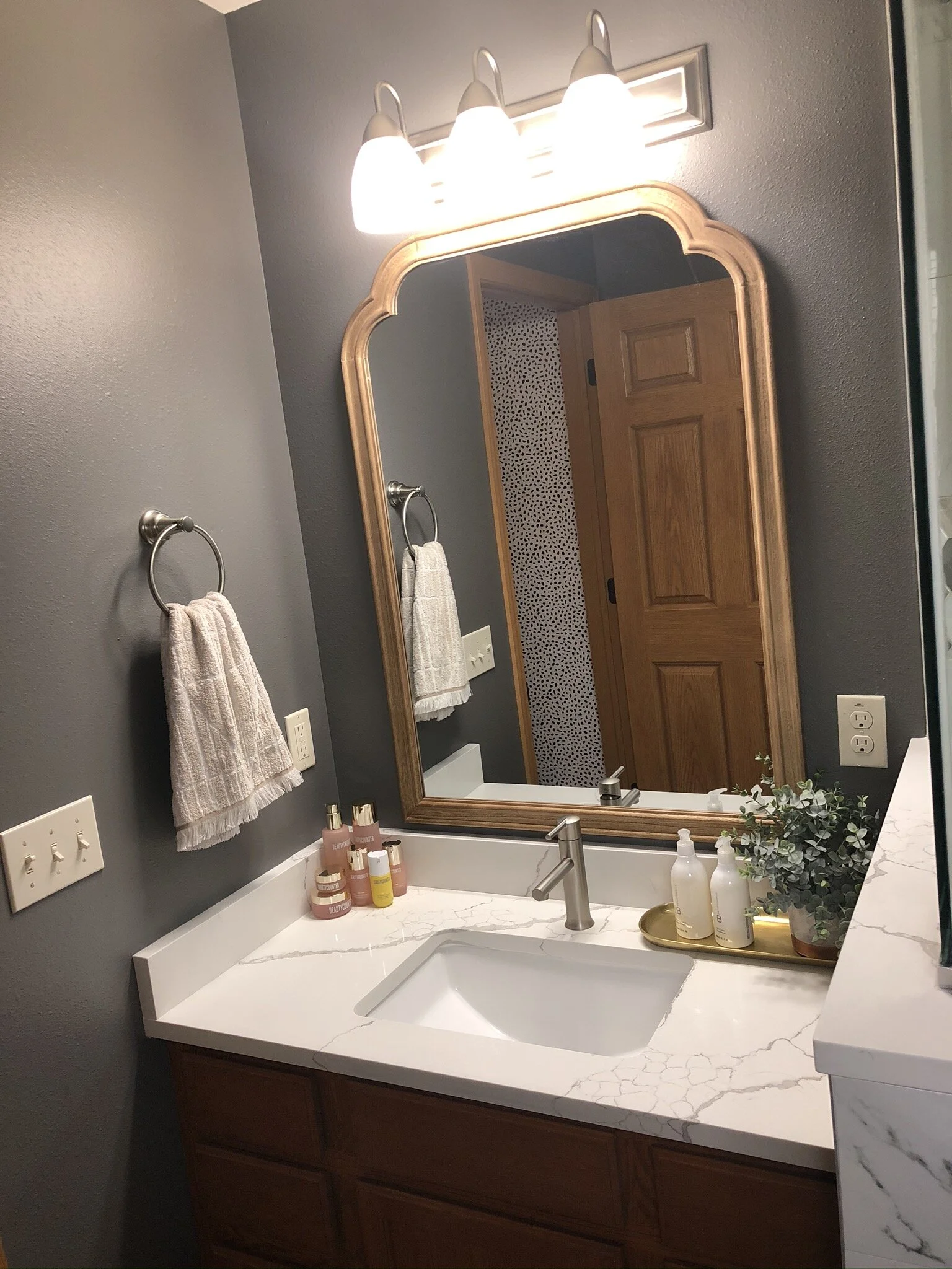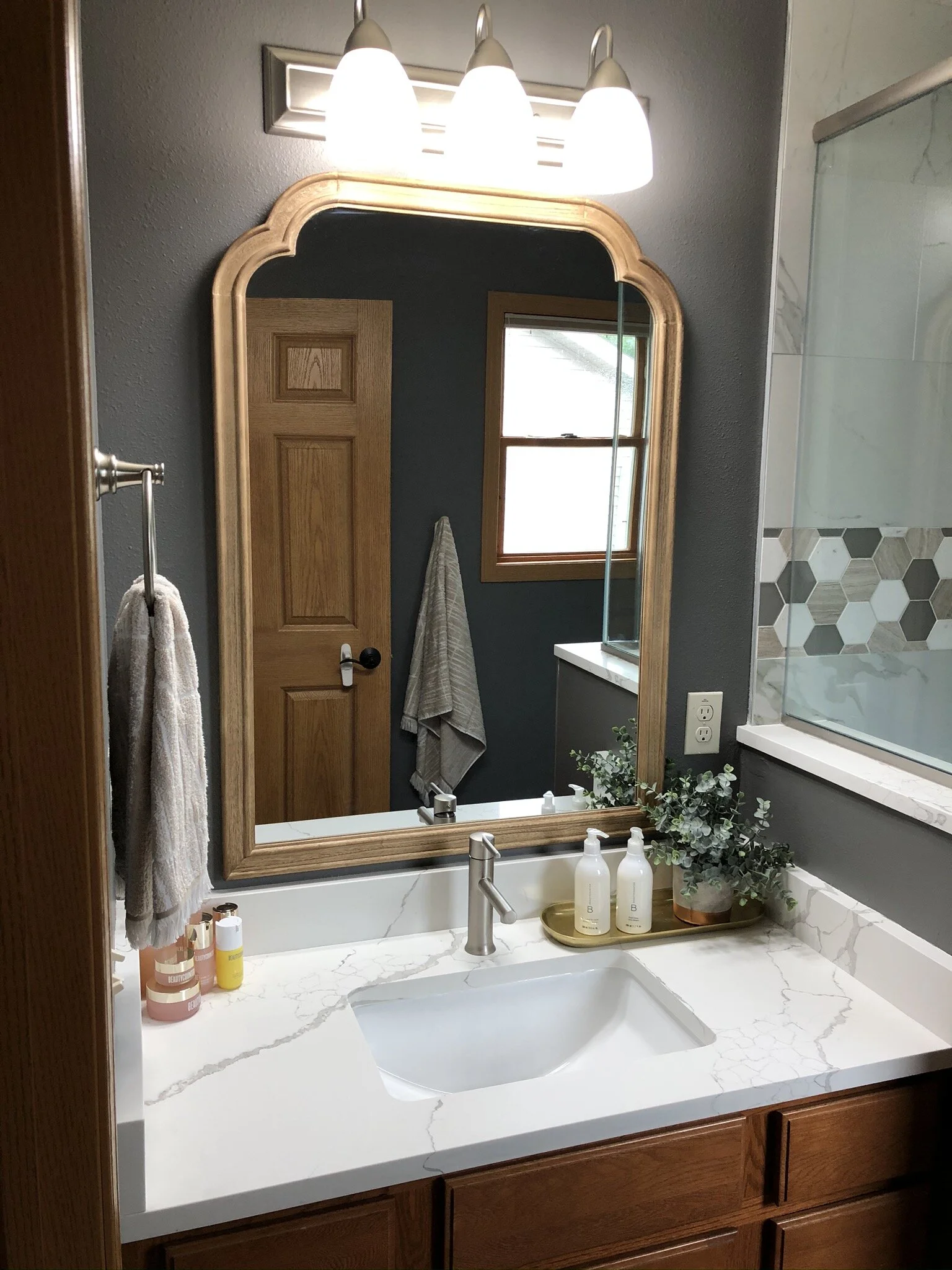 This master bathroom was originally built for retired couple who opted for the step-in tub. We needed to upgrade into a shower and wanted to update the rest of the space as well. We started by removing (and selling) the large step-in bathtub. We selected a streamlined extra deep tub for soaking and a combo showerhead that had a rain shower fixture as well as a handheld option. We carried the marble tile design through to the new quartz vanity top and opted to go with a hexagon accent tile for the niche box. The dark gray paint was a nice contrast to all the white tile and the pops of greenery and wood details pull it all together.