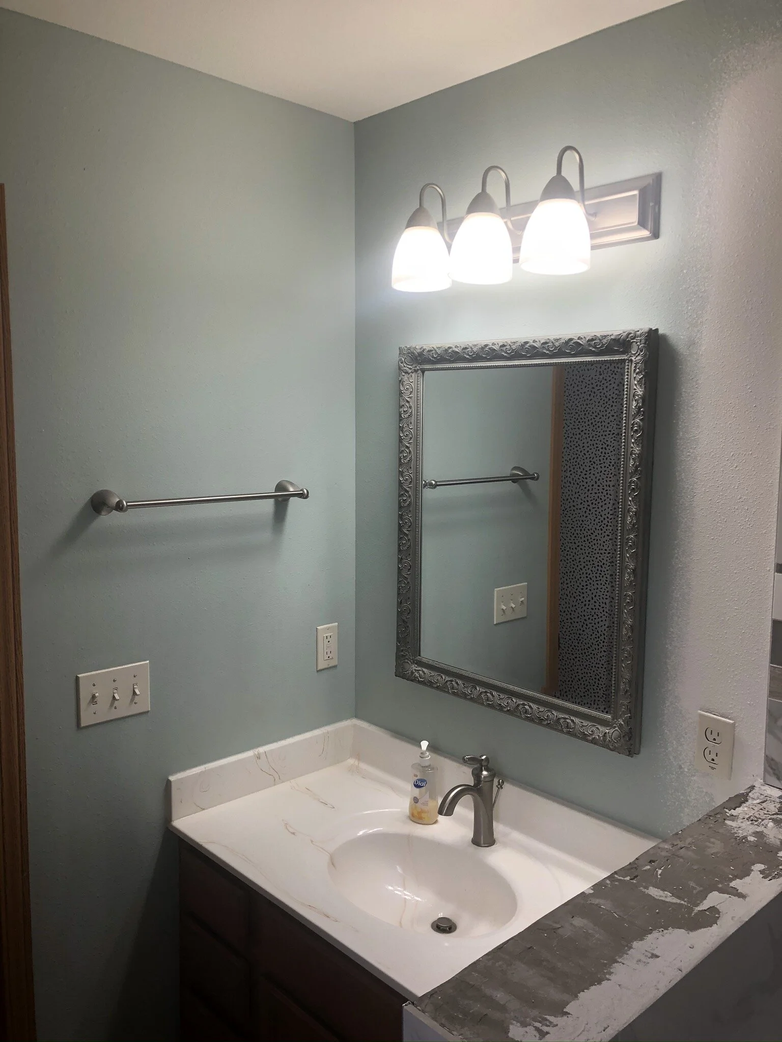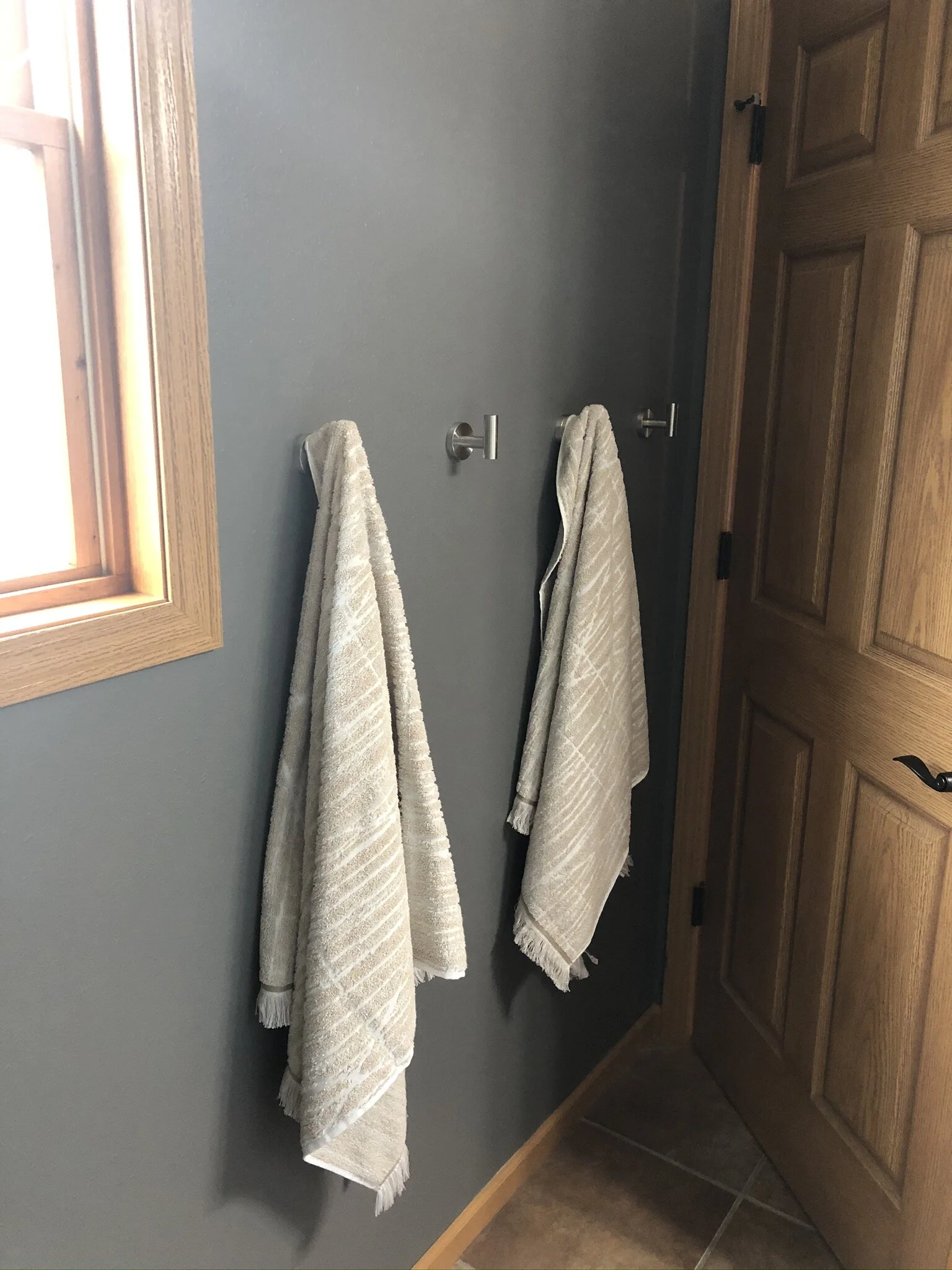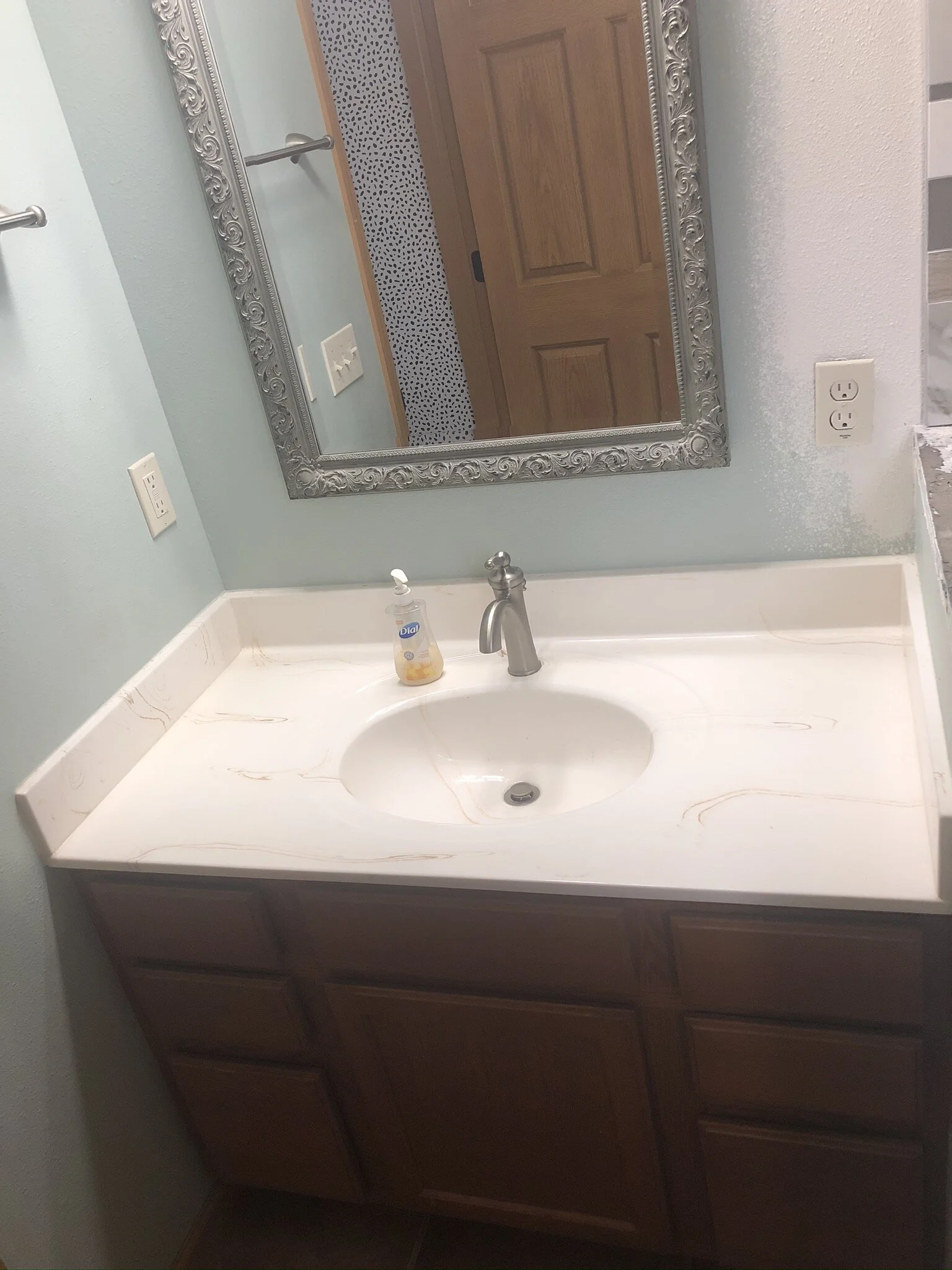 This master bathroom was originally built for retired couple who opted for the step-in tub. We needed to upgrade into a shower and wanted to update the rest of the space as well. We started by removing (and selling) the large step-in bathtub. We selected a streamlined extra deep tub for soaking and a combo showerhead that had a rain shower fixture as well as a handheld option. We carried the marble tile design through to the new quartz vanity top and opted to go with a hexagon accent tile for the niche box. The dark gray paint was a nice contrast to all the white tile and the pops of greenery and wood details pull it all together.
