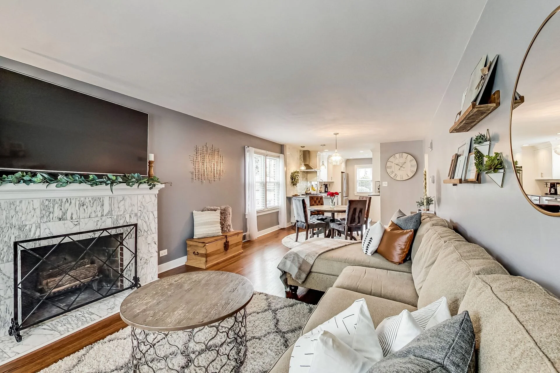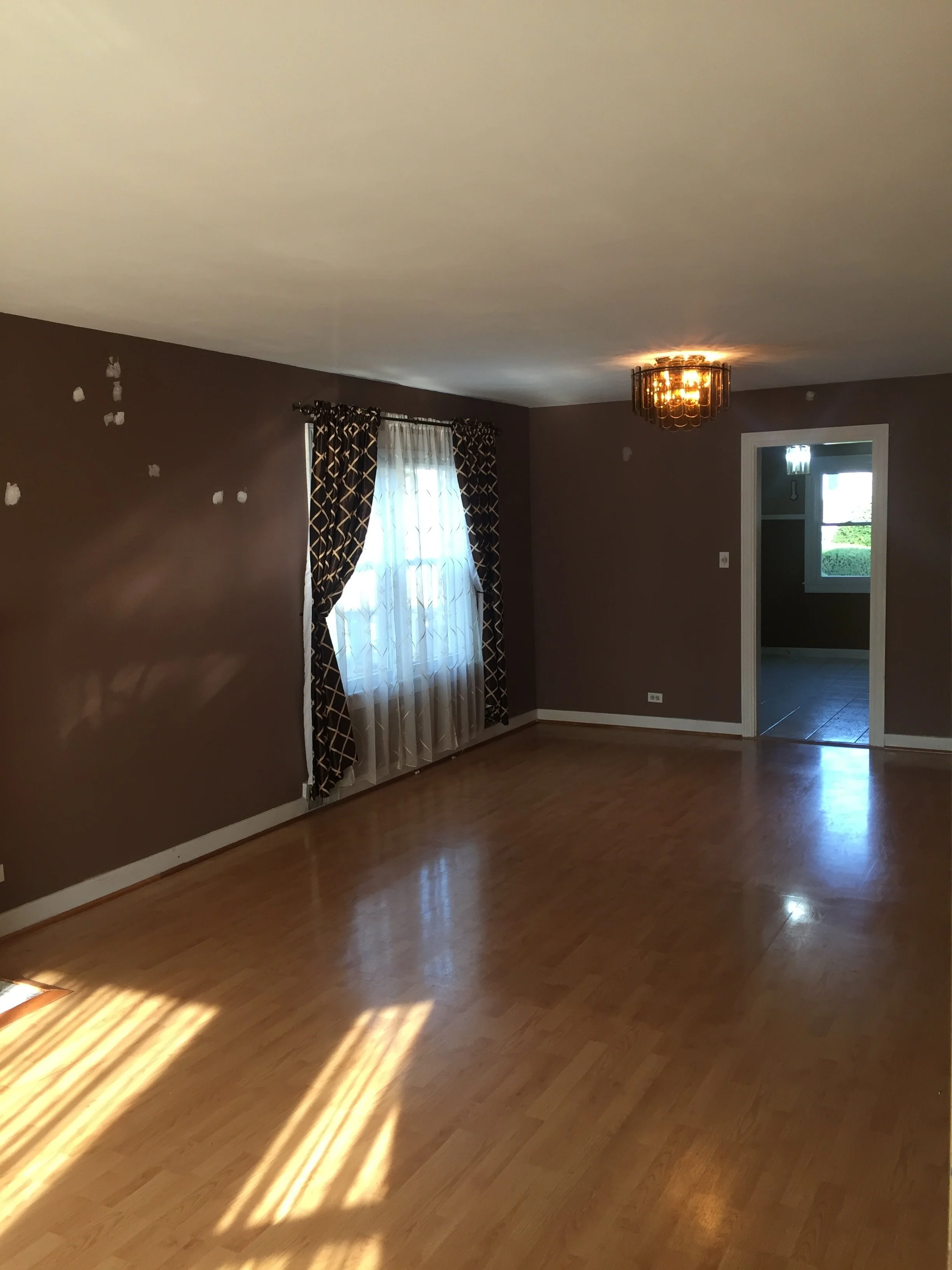 We changed almost everything in this room from the floors and paint to the light fixtures and window treatments. It felt so dark and closed off before with the brown walls and heavy curtains. Our goal was to give it a bright, crisp look while letting more of the natural light in. This home had a very open concept, so we wanted the kitchen to flow nicely into the dining and living area.