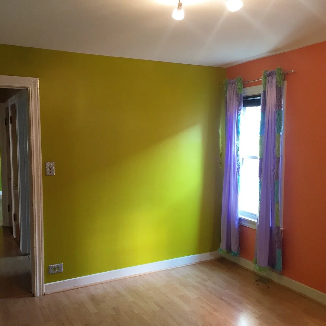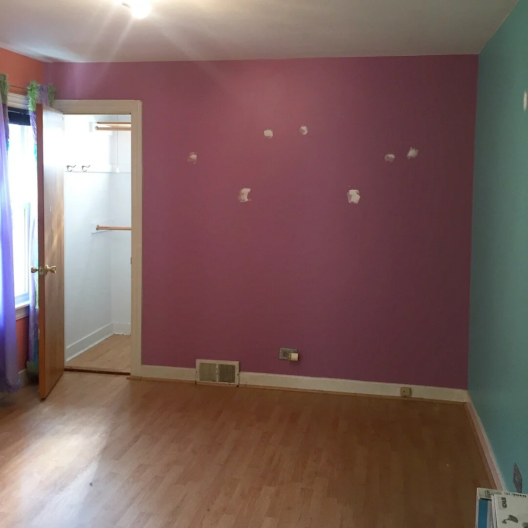 This room was WILD when we got our hands on it. All four walls were different colors, the curtains were furry and resembled something out of Monsters, Inc, and cheap laminate flooring was covering beautiful hardwoods. The goal was a gender neutral, whimsical nursery.