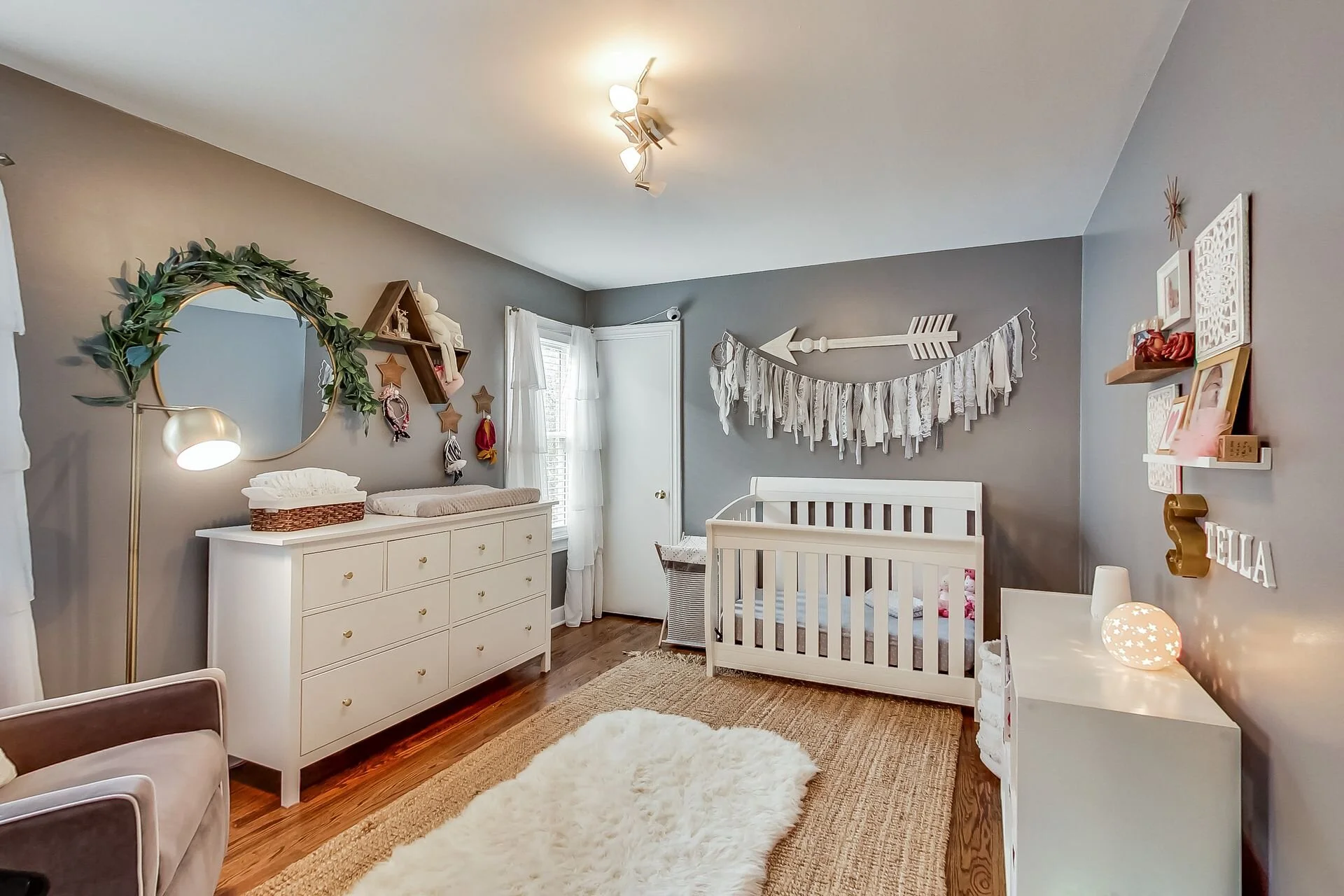 Styling this room was super fun. The handmade fabric garland above the crib and the faux fur rug added a cozy feeling to the room, while the pops of metallic in the mirror, dresser knobs, and lamp gave the room a pop of sophistication. Nurseries are one of our favorite projects to do!